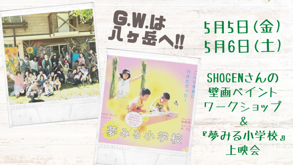 次回イベントは2023年5月5日(金祝)、5月6日(土) 昨年の公開以来、大きな反響を呼んでいるミライの教育ドキュメンタリー映画『夢みる小学校』の上映会! そして、ペンキ画家SHOGENさんを迎えて壁画ペイントワークショップ&トークショー! これらのイベント... -